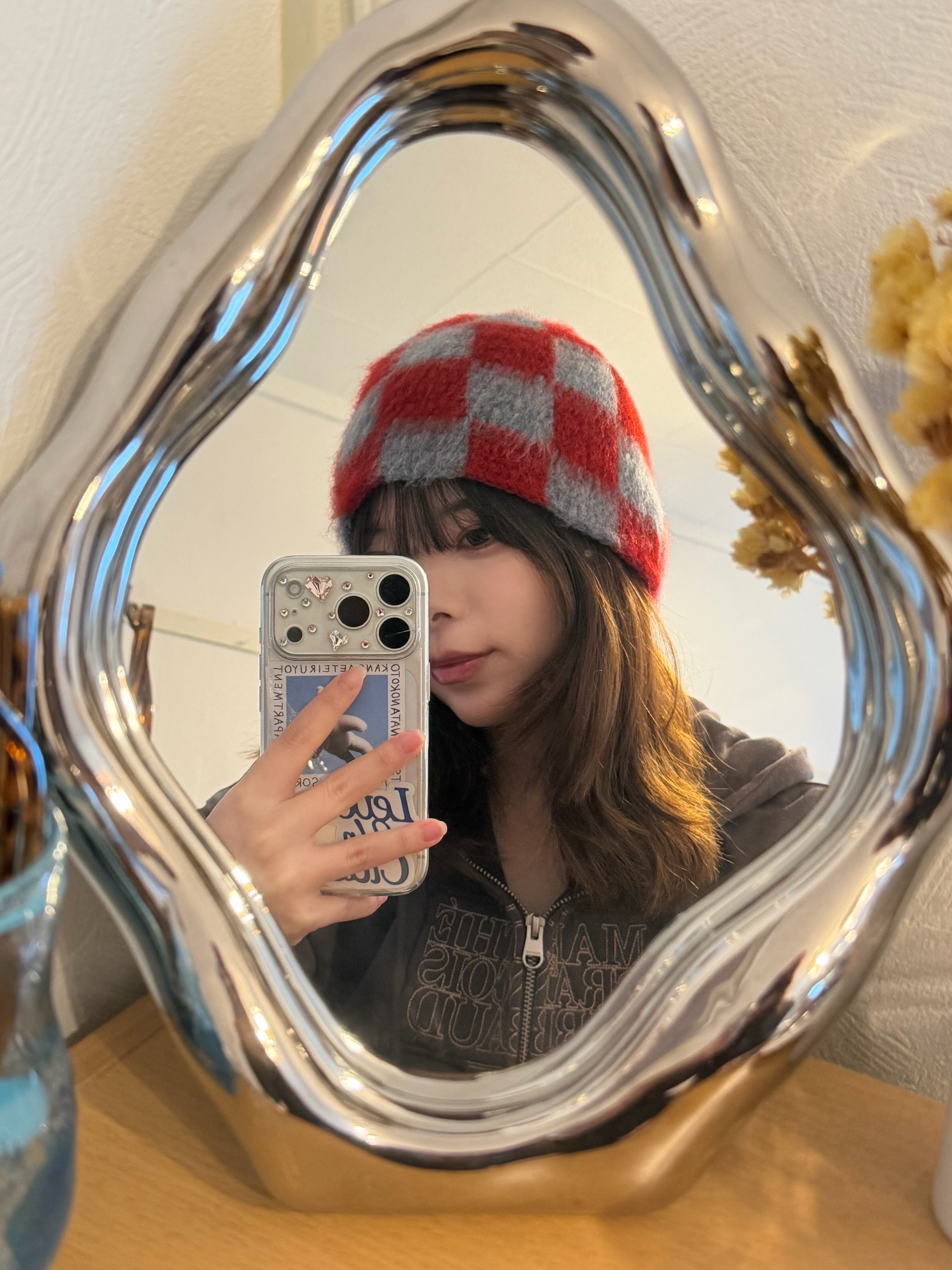レッドとグレーのチェッカー柄が目を引くビーニー。