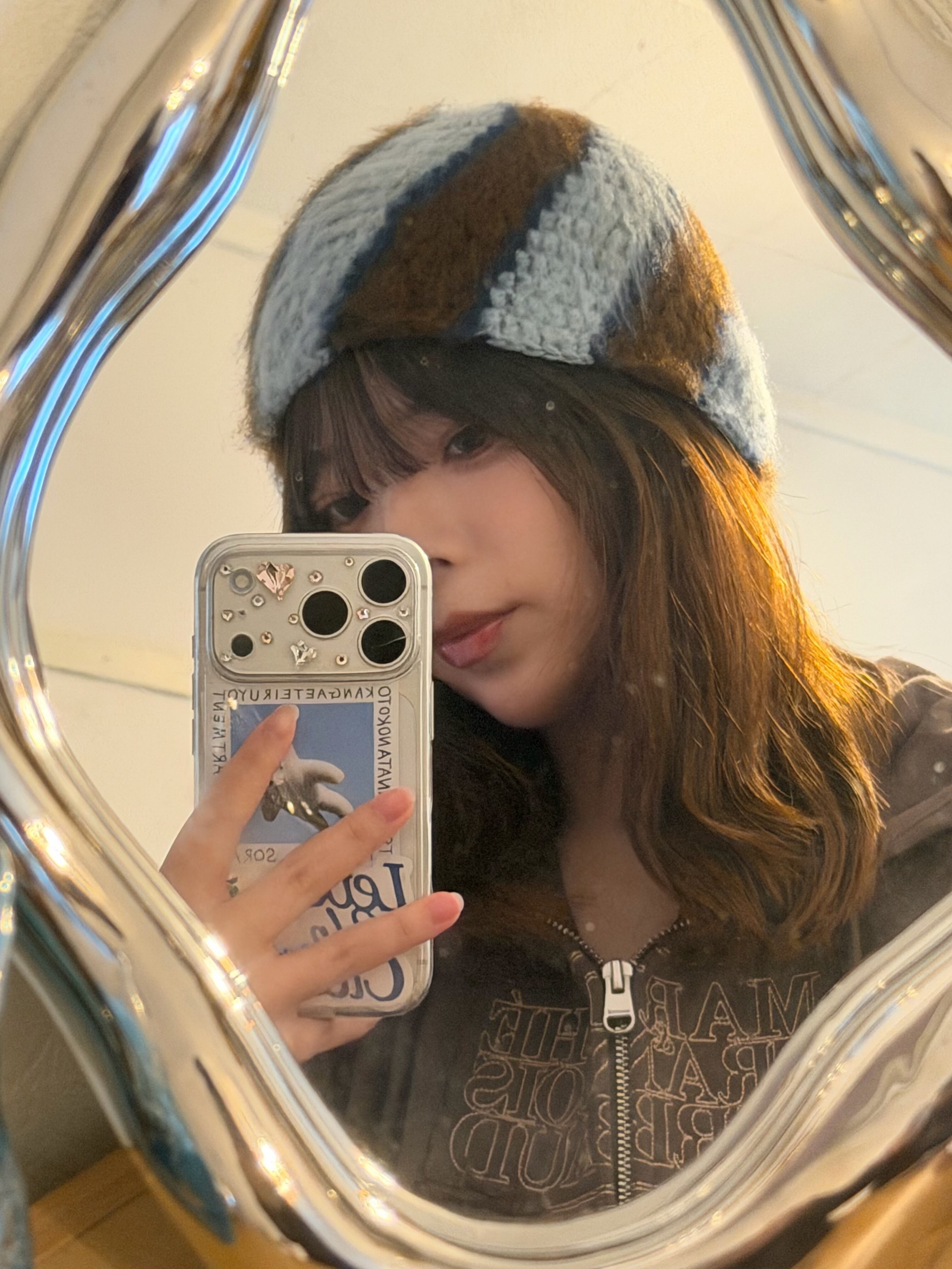 やわらかいブルーに、ブラウンとネイビーを重ねたストライプビーニー。